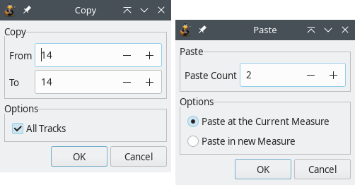 Measure → Copy Measure will copy the given measures(s) to the clipboard. If your song has more than one track, you can choose to copy the given measure(s) only from the current track or from all tracks.