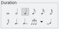 Measure → Paste Measure will insert the previously copied measure(s) once or multiple times, depending on the given "Paste Count". If you previously only copied measures from one single track, these measures will be inserted in the currently opened track at the current cursor position. If you copied measure(s) from all tracks, then the notes and tablatures will be inserted in all tracks. If you paste the measure(s) into another song, the tracks will be filled up from the first to the last track, as long as there are tracks left in the destination song. If you choose to paste the notes and tablatures into the current measure(s), all present content will be overwritten. In case you select "Paste in new Measure", the notes and tablatures will be pasted to newly inserted measure(s) after the current cursor position. Your song will now be longer than before. Notes and beatsFinally, the Beat menu lets you edit the single sounds: Notes and tablatures. Note DurationThe note duration is set in the submenu Beat → Duration or the "Duration" edit toolbar section.