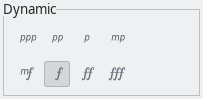 The first seven entries simply change the selected note(s) to whatever you select, ranging from whole note to sixty-fourth note. This comes in handy if you need to make a change that is more than one note increment (i.e., quarter note to sixteenth note). You can alternately use the +/- keys on a standard numeric keypad to move one increment at a time. The next three menu entries will change the note’s values to dotted, double-dotted, and a wide variety of "division type" values. If you do not understand the difference between the various note durations, you may want to research it a bit before you begin editing tabs, as you may find yourself quickly getting lost. Any basic music theory guide should cover these topics. A good starting place (as always) is the Wikipedia’s pages on music theory and music notation: Clicking on the menu entriy Beat → Tied Note or the last icon in the Duration toolbar will "tie" the currently selected note to the one before it. This feature basically takes the value of two notes and combines them into one. The most common use for this feature is when you have a note that begins in one measure and ends in the next. Tying notes is really just a way of keeping the score clean and organized. If you need more information, you may want to research musical notation via the links above. Note dynamicBy selecting a different icon than the current in the Dynamic toolbar section or the Beat → Dynamic submenu, you change the dynamics of the note you are editing. They gradually scale from Piano Pianissimo (ppp), which is the most silent, to the Forte Fortissimo (fff) which is loudest.