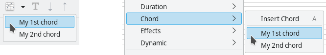 You can enter previously saved chords directly into your tablature from the Chord Library, accessible from the small down arrow on the right of the Chord Editor icon in the toolbar or from the Beat → Chord submenu:
