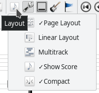 LayoutThere are several layout types in TuxGuitar. You can switch between them with the Layout icons on the edit toolbar or in the View pulldown menu. They all change the view of tablature and scores in the main editor window.