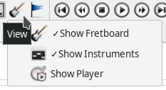 View and layoutWith the View pulldown menu and the related toolbar icons you can customize the appearance of TuxGuitar's main window and open different dialogs. You can change the current view also during playback. Enable and disable toolbars and track tableThe first three entries in the View menu let you show and hide the main elements of the TuxGuitar window: