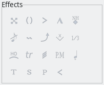 Note effectsAs you already know, playing guitar (and any other instrument) isn’t just playing the notes in the right duration and dynamics. There are several "tricks" that are unique for any instrument. TuxGuitar supports effects specific for guitar and bass guitar. Almost all note effects have an icon on the toolbar, but also can be accessed in Beat → Effects menu. If several notes are selected with click & drag then effect is applied on all selected notes. Else, the effect is applied on the current cursor position.