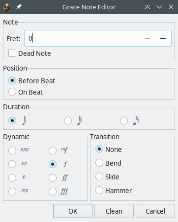 Note that A.H(4) and A.H(9) sound the same... The number besides denotes the "fret offset" between the original note and the harmonic "hot spot". The difference between Artificial, Pinched and Tapped Harmonics is only in the playing technique, but Semi Harmonics even sound different on TuxGuitar - you can hear the original note along with the harmonic note. Grace noteGrace note is a music ornament. You can hear it very often in music, and it sounds like an attempt to play a note as short as possible. Grace notes in tabs are displayed smaller than the regular notes and seem to have no duration. In sheet music grace notes are represented as a small note before a regular note, sometimes with a slash through the note stem. In TuxGuitar grace note can be applied on a position where a note already exists. Choosing to insert a grace note brings you the grace note editor dialog.