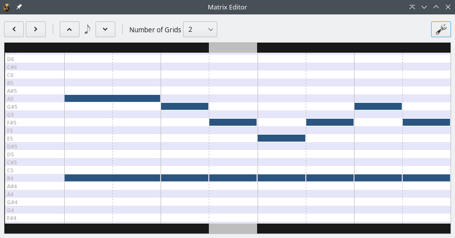 Matrix EditorThe Matrix Editor is a useful tool for editing the percussion tracks. It can alse edit the ordinary tracks, but it is much less useful. It is accessed by the View → Show Matrix menu. Basically, it divides the current measure into segments and displays the possible percussion sounds. Not only you can view the measure and the sounds in the matrix, but by clicking on one block of the matrix you add/remove the sound from the tab.