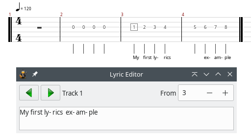 TuxGuitar supports writing lyrics in a track, so you can make a track which contains lyrics and the melody of singing. The lyrics editor is accessed by selecting the Lyrics menu item.