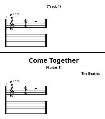 The reason why these settings are important is that whatever you type in the "Name" and "Author" boxes will show up on the first page of your tabs when you print or export them. So, make sure you set them if you plan viewing these tabs outside of TuxGuitar! The difference can be seen below.