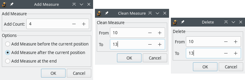 Measure → Copy Measure will copy the given measures(s) to the clipboard. If your song has more than one track, you can choose to copy the given measure(s) only from the current track or from all tracks. You can also specify whether the markers should be copied or not.