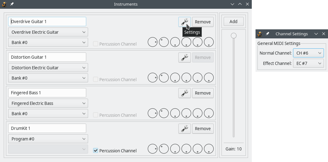 The most interesting feature of the Instruments dialog is adjusting volume for each track (to be more precise: for each MIDI channel) with the first control dial.