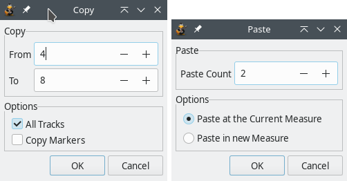 Measure → Copy Measure will copy the given measures(s) to the clipboard. If your song has more than one track, you can choose to copy the given measure(s) only from the current track or from all tracks. You can also specify whether the markers should be copied or not.