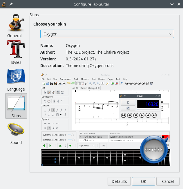 The default skin for TuxGuitar is Oxygen, but TuxGuitar comes with other great skins. You can change the current skin in the Tools → Settings dialog, choosing the Skins tab. A preview of each skin is available.