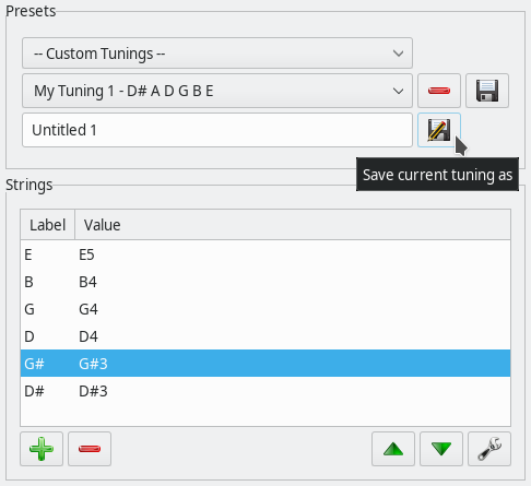 If you want to use a tuning that is not included in the presets, you can select -- Custom Tunings -- in the first dropdown menu and edit the tuning of each individual string under Strings. You can now save your own tuning in the list of custom tunings.