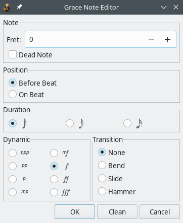 Next you can choose note Duration. "As short as possible" is welcome, so 1/64 note is default, but you can also pick 1/32 and 1/16 note if it suits your needs. Dynamics of the grace note is also an important property. By default, dynamics of a "normal" note is selected, but in editor dialog you can make grace note louder or more quiet than the succeeding note.