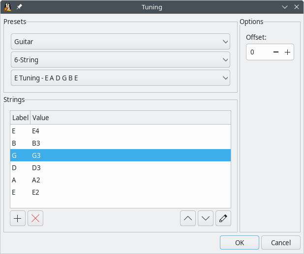 This one is pretty self-explanatory. You can select your stringed instrument, the number of strings on it (i.e., 4 if you're a bass player, 3 if you play in the band The Presidents of The United States of America) and the tuning of the instrument in case you use alternate tunings. It is important that you specify the correct tuning, otherwise the actual score staff of your tabs will be inaccurate, and nobody wants that.