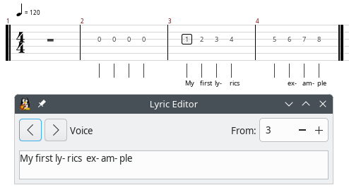 TuxGuitar supports writing lyrics in a track, so you can make a track which contains lyrics and the melody of singing. The lyrics editor is accessed by selecting the Lyrics menu item.