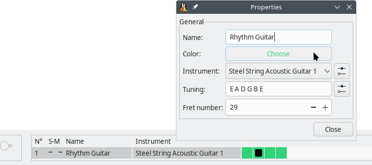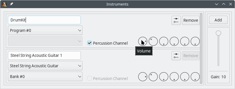Here you set up the sound that your tracks will play back from your soundbank. TuxGuitar comes with its own soundbank called "Magic Sound Font 2.0", but you can use others as well. Most soundbanks have a plethora of sounds which go far beyond just guitars, so be as creative as you want.