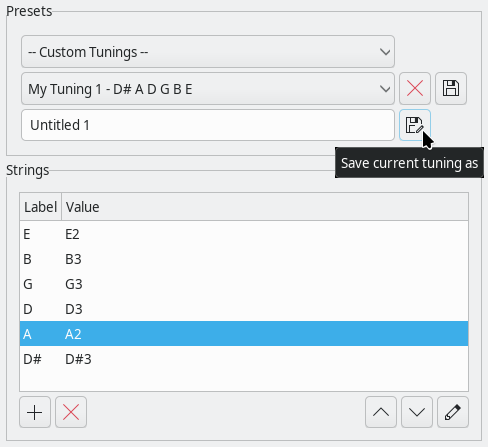 If you want to use a tuning that is not included in the presets, you can select -- Custom Tunings -- in the first dropdown menu and edit the tuning of each individual string under Strings. You can now save your own tuning in the list of custom tunings.