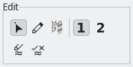 Icons in the second line of Edit Toolbar and related menu items are related to Free Edition Mode which disables all duration controls when editing a measure. Free Edition Mode menu item and toolbar button toggles this edition mode. Show measure errors opens a dialog to help you locate and fix invalid measures in song.
