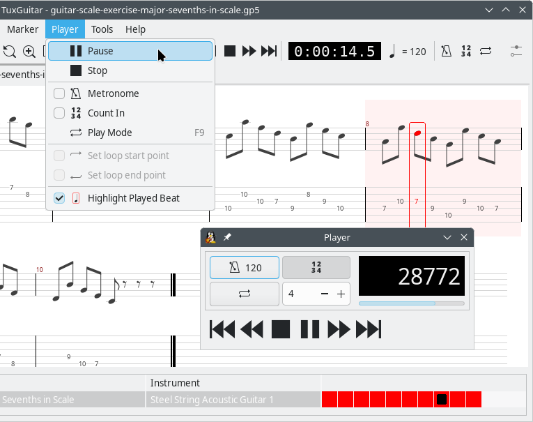 As you can see in the snapshot of the TuxGuitar main window above, the currently playing measure gets a red background, the beat is highlighted in red and has a frame around it. You can switch the frame on or off via the menu Player → Highlight Played Beat or define a corresponding keyboard command under Tools → Shortcuts. The color of the highlighting can be changed under Tools → Settings → Styles.