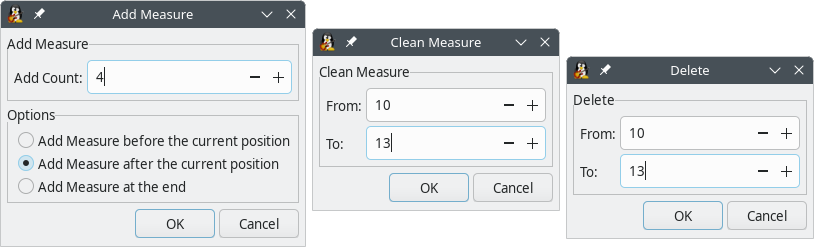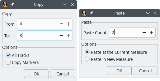 Measure → Copy Measure will copy the given measures(s) to the clipboard. If your song has more than one track, you can choose to copy the given measure(s) only from the current track or from all tracks. You can also specify whether the markers should be copied or not.