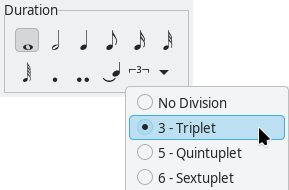 The last entry contains a sub menu where you can select a wide variety of Division Types (Tuplets). A tuplet lets you divide a group of regular notes into a different number of shorter notes.