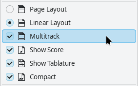 The first menu item is Page Layout. Its alternative is the second item: Linear Layout. Page Layout displays the tablature and scores like on the paper sheets, with line breaks. On the other side, Linear Layout shows the instrument in a single line, expanding to the right.