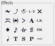 Almost all note effects have an icon on the toolbar, but also can be accessed in Beat → Effects menu. If several notes are selected with click & drag then effect is applied on all selected notes. Else, the effect is applied on the current cursor position.