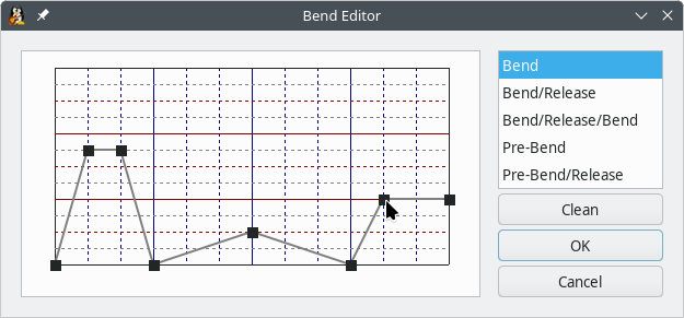 First, notice the list box on the right of the dialog. Those are the presets which are most often used: Bend, Bend/Release, Bend/Release/Bend, Pre-Bend and Pre-Bend/Release. Bend only makes gradual transition to the target note, while Bend/Release also returns it to the beginning note. Pre-Bend is played when you first bend (add tension) to the string, and after that pick the string, so the first tone heard has higher pitch, and then gradually returns to the original note. You should notice that all the presets make bend 1 note (2 frets) higher, so you may need some intervention in the Editor to make the bend sound properly.