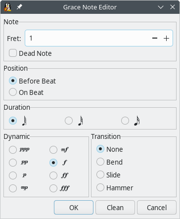 Next you can choose note Duration. "As short as possible" is welcome, so 1/64 note is default, but you can also pick 1/32 and 1/16 note if it suits your needs. Dynamics of the grace note is also an important property. By default, dynamics of a "normal" note is selected, but in editor dialog you can make grace note louder or more quiet than the succeeding note.