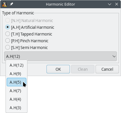 Otherwise, if you choose Artificial, Pinched, Tapped or Semi harmonics, you should choose a value from the combo box on the bottom of the dialog. If you chose artificial harmonic, you would be able to choose between these values: