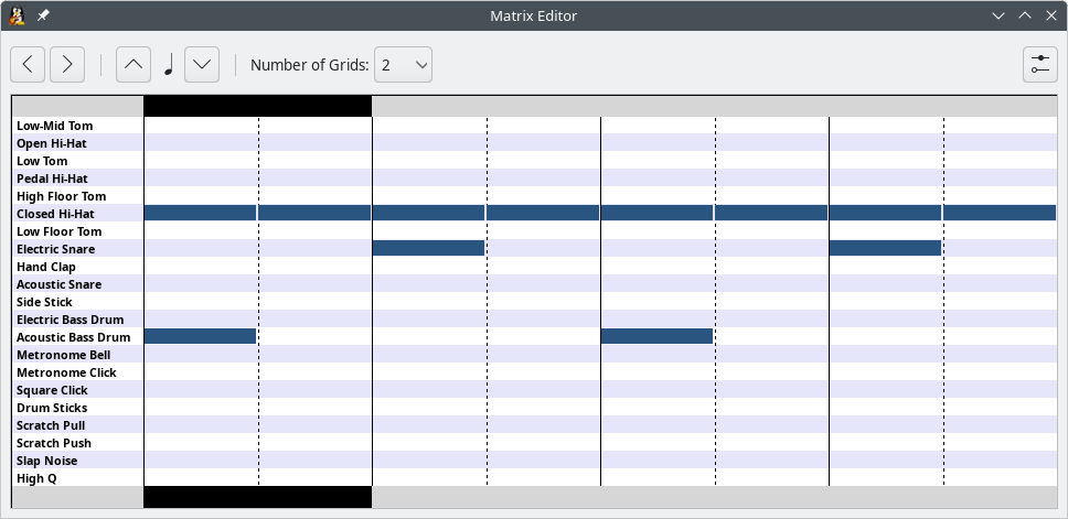 The Matrix Editor is a useful tool for editing the percussion tracks. It can also edit the ordinary tracks, but it is much less useful. It is accessed by the View → Show Matrix menu.