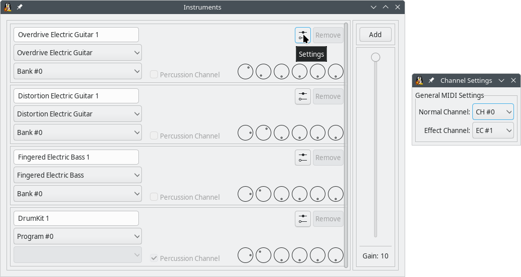 The most interesting feature of the Instruments dialog is adjusting volume for each track (to be more precise: for each MIDI channel) with the first control dial.