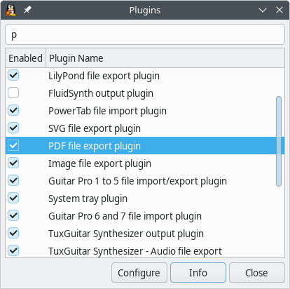 The plugins dialog is accessed through the Tools → Plugins menu. In the dialog you can enable or disable all installed plugins. Some of the plugins can also be configured with the "Configure" button. The "Info" button shows the version, author and description of the selected plugin.