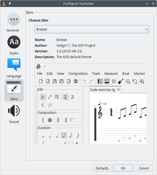 The default skin for TuxGuitar is Breeze, but TuxGuitar comes with other great skins. You can change the current skin in the Tools → Settings dialog, choosing the Skins tab. A preview of each skin is available.