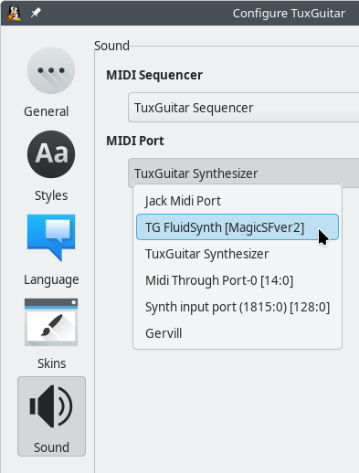 So it depends on your system settings, but anyway, if the proper plugin is enabled and working you should see the system ports in the MIDI Port list in the Sound tab of the Tools → Settings dialog. Choosing the right one enables your native MIDI sound in TuxGuitar.