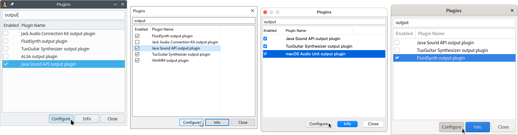The images above show all available audio output plugins on Linux, Windows, macOS and FreeBSD.